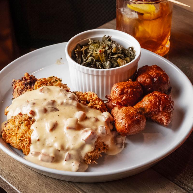 Take a step back in time to our “speakeasy-style” restaurant, where the ambiance exudes elegance while retaining an inviting warmth. The interiors are a perfect blend of sophistication and comfort, creating an atmosphere where you can unwind, celebrate, and create cherished memories. Our menu offers a fine dining experience with a southern flair. We have both indoor and covered patio seating.